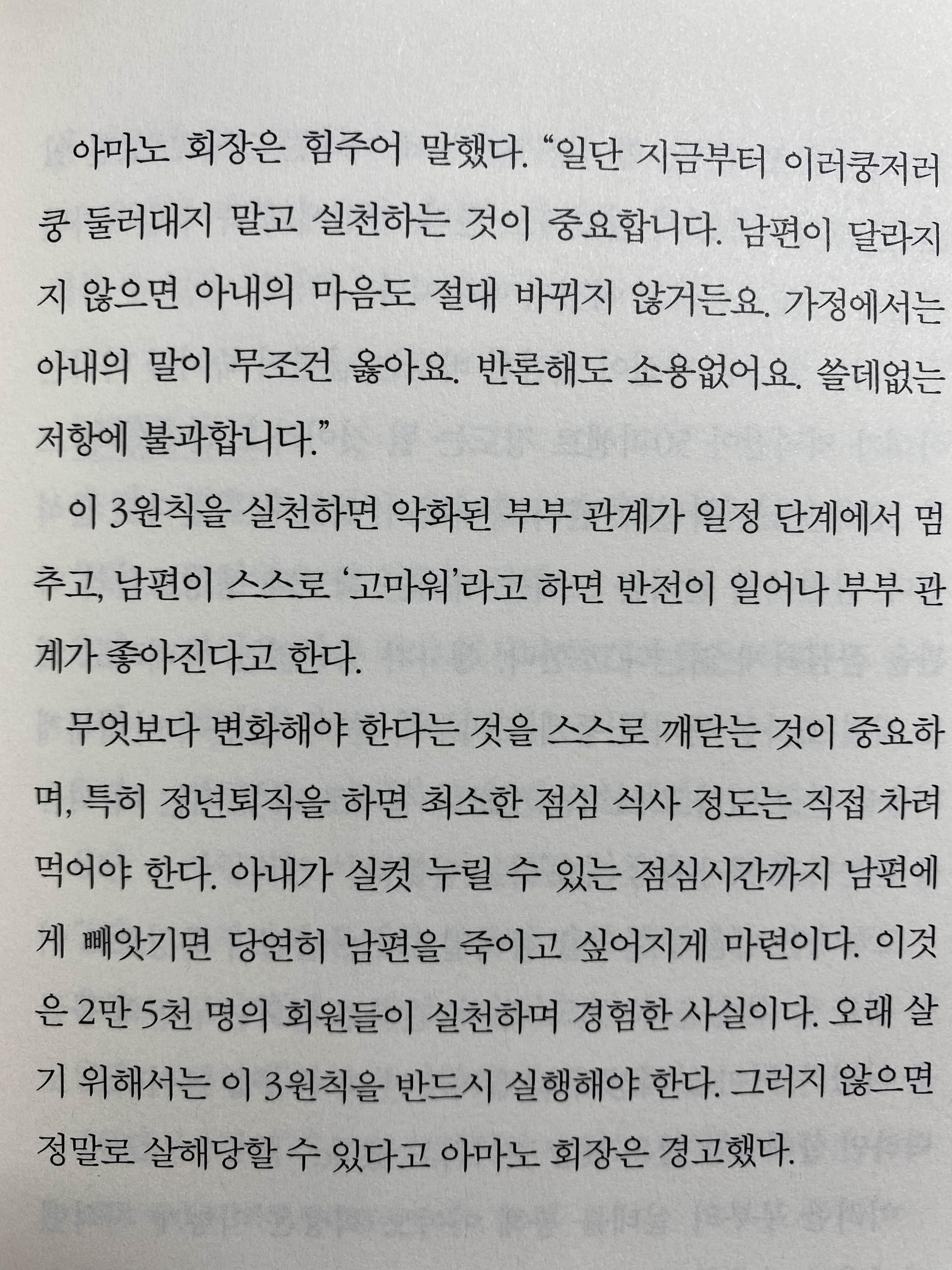 '고마워, 미안해, 사랑해'라는 말은 진심으로 잘 해야 하는 말인 것 같다. 하지만 이 책에서는 왠지 진심보다 말부터 해야 당신이 산다는 뉘앙스도 느껴진다. '이기지 않는 3원칙'도 마치 '살려면 이렇게 해야 한다'는 구호같다. 남자들이 술자리에서 '남편의 삶'을 안주 삼아 이야기하는 장면이 떠오르기도 한다.